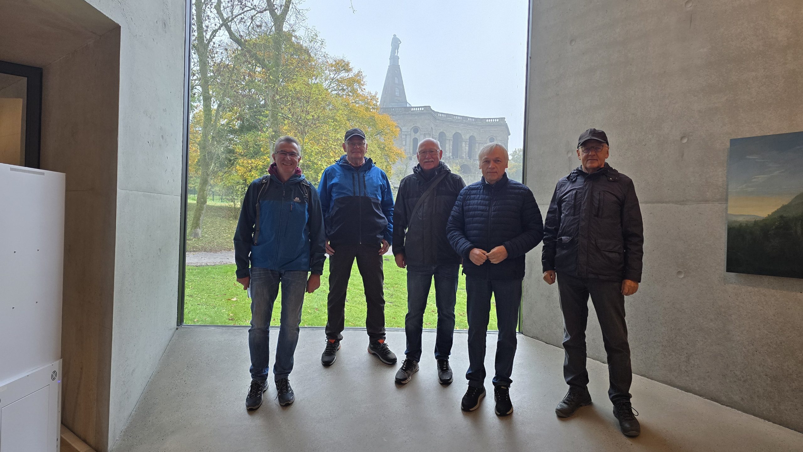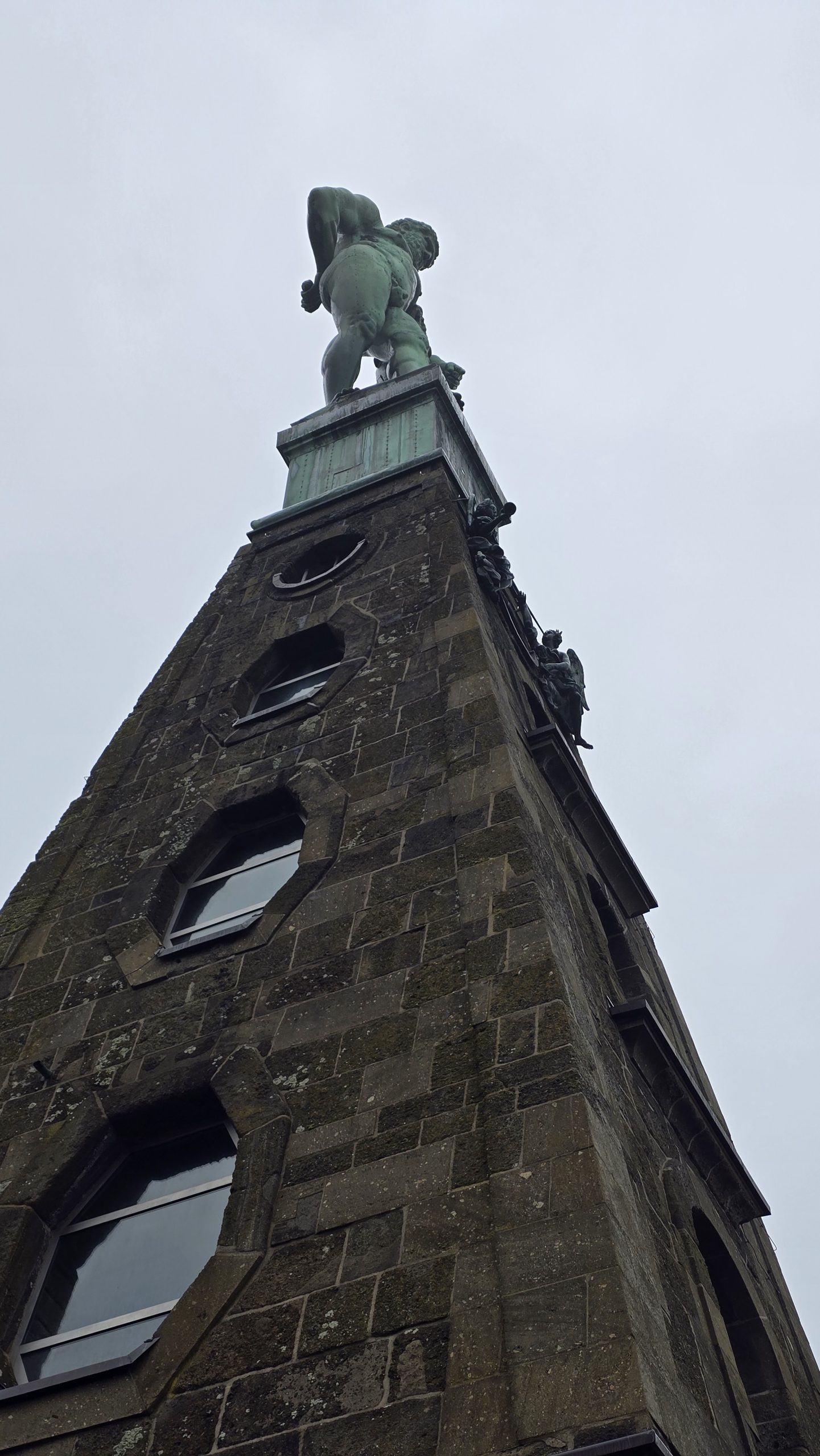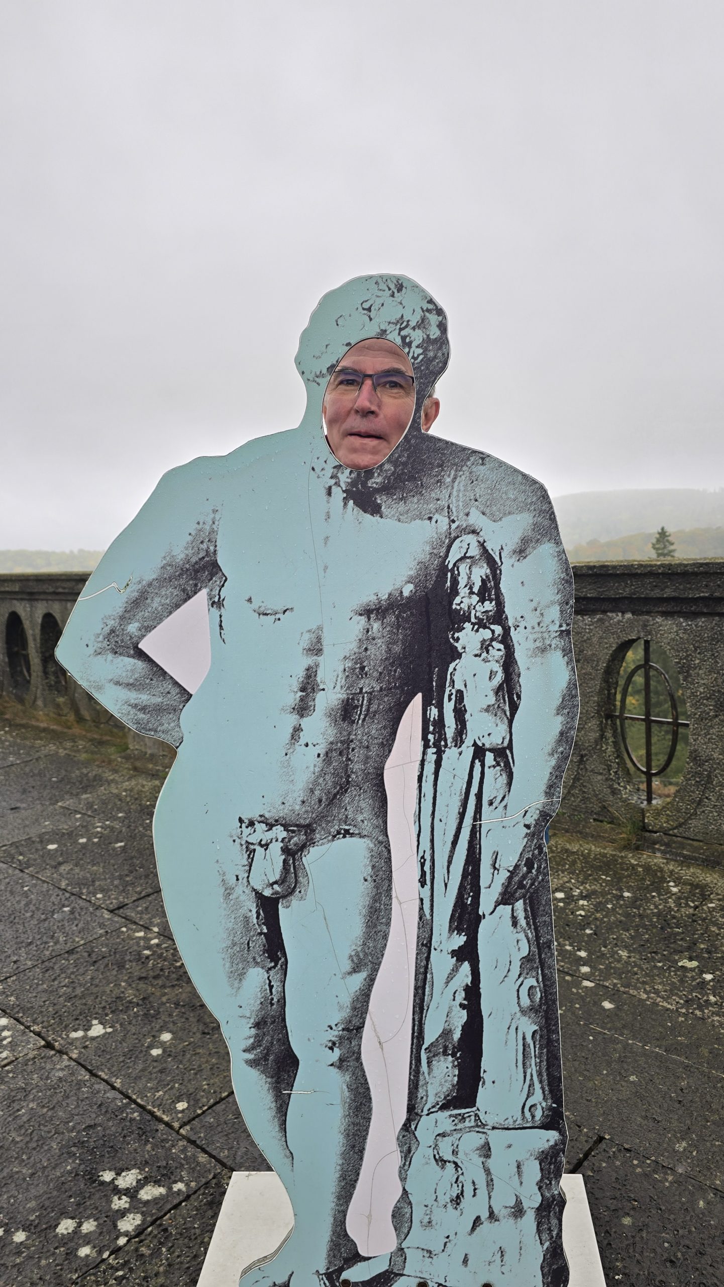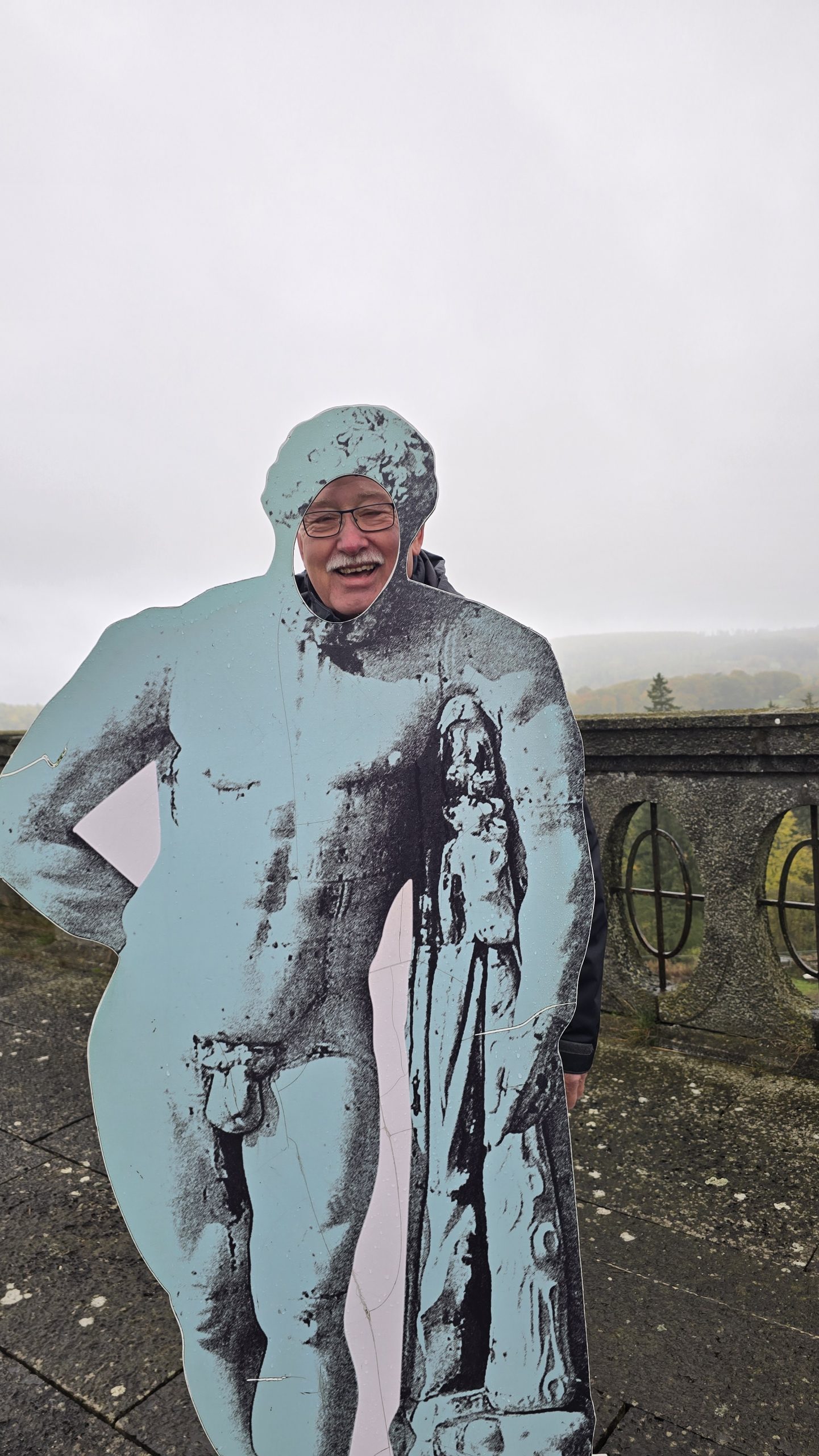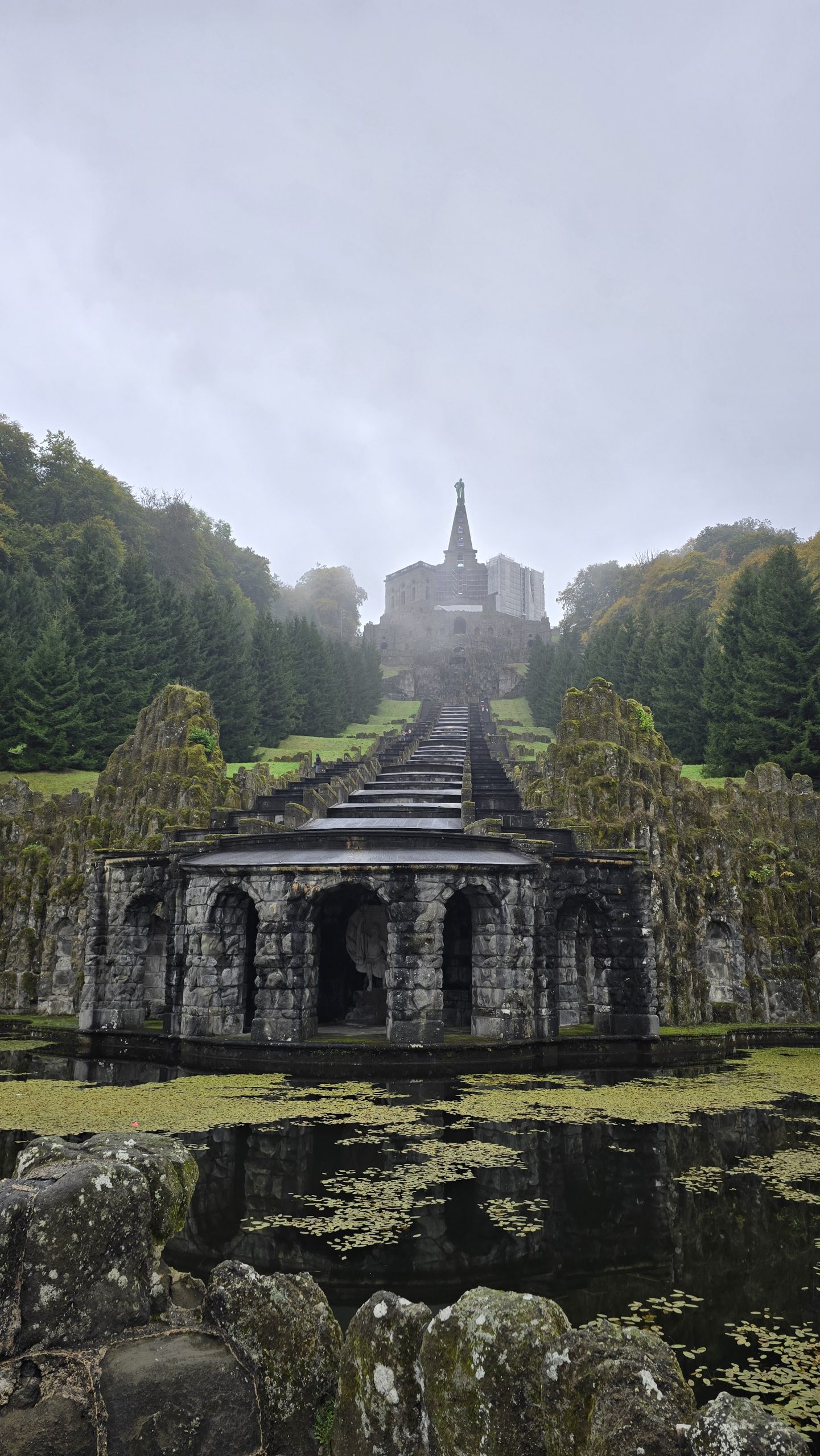 Nach einer rund 140 Kilometer langen Autofahrt erreichten wir das obere Besucherzentrum des Bergparks Wilhelmshöhe. Dort stärkten wir uns zunächst mit belegten Brötchen und Mettwürsten, die Thom freundlicherweise beisteuerte, sowie Getränken von Ulli. Die Mitarbeiter im Besucherzentrum begrüßten uns herzlich und so entstand gleich unser erstes Gruppenfoto. Unsere erste Etappe führte uns zum Herkules, für den wir eine schier endlose Zahl an Stufen meisterten. Von oben bot sich ein erster Blick auf den Wilhelmspark, der am Morgen jedoch noch in dichten Nebel gehüllt war.