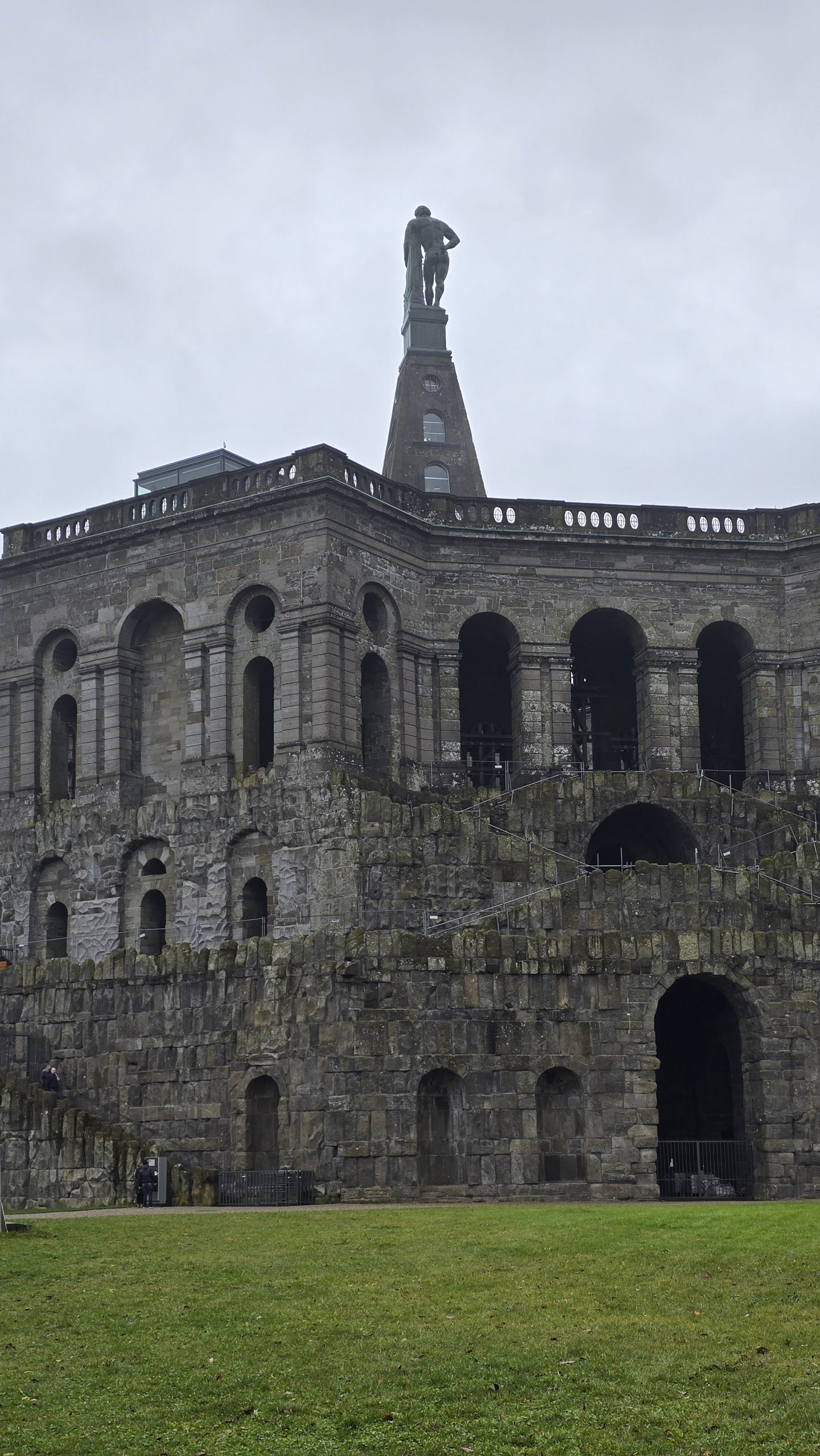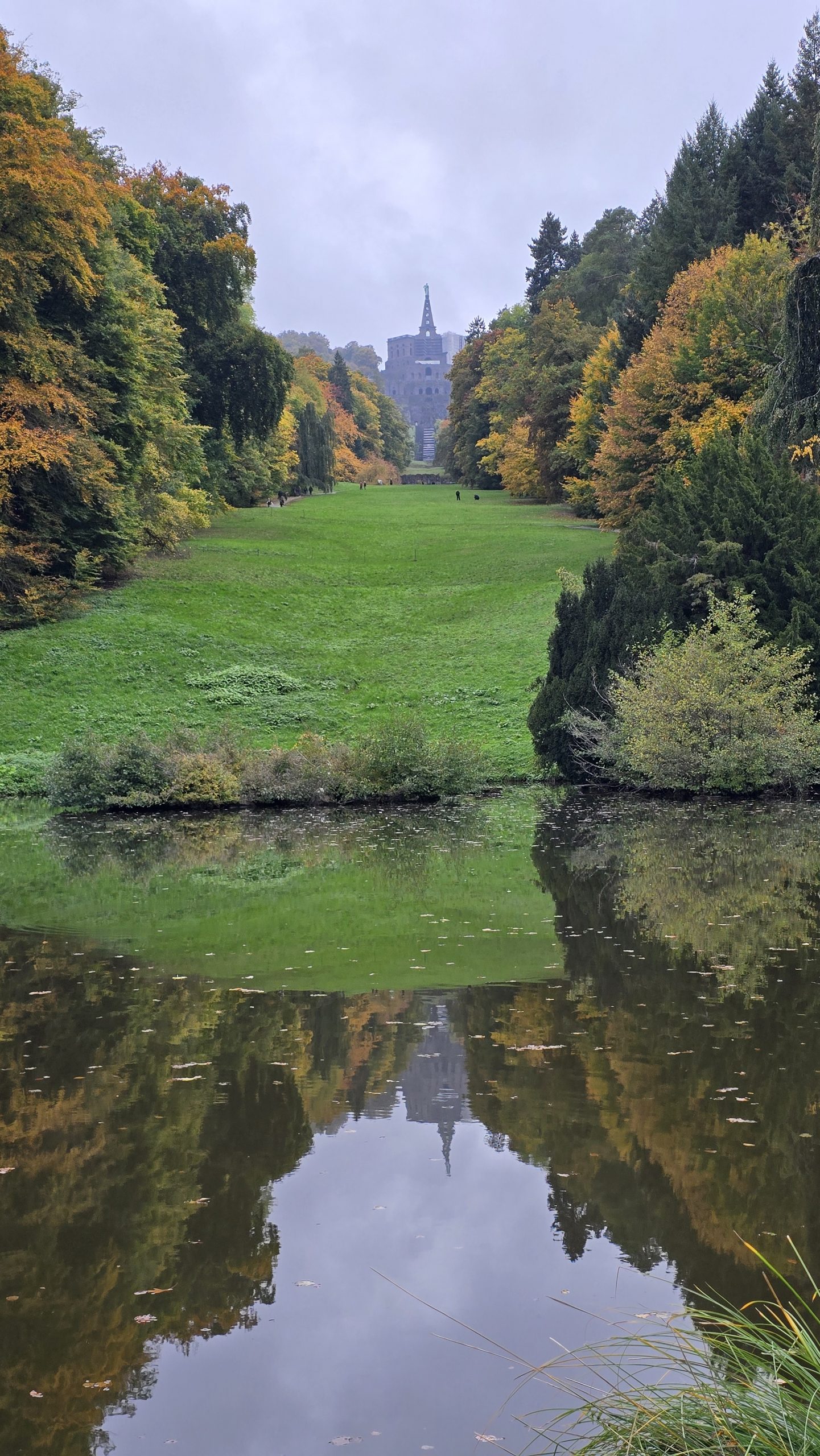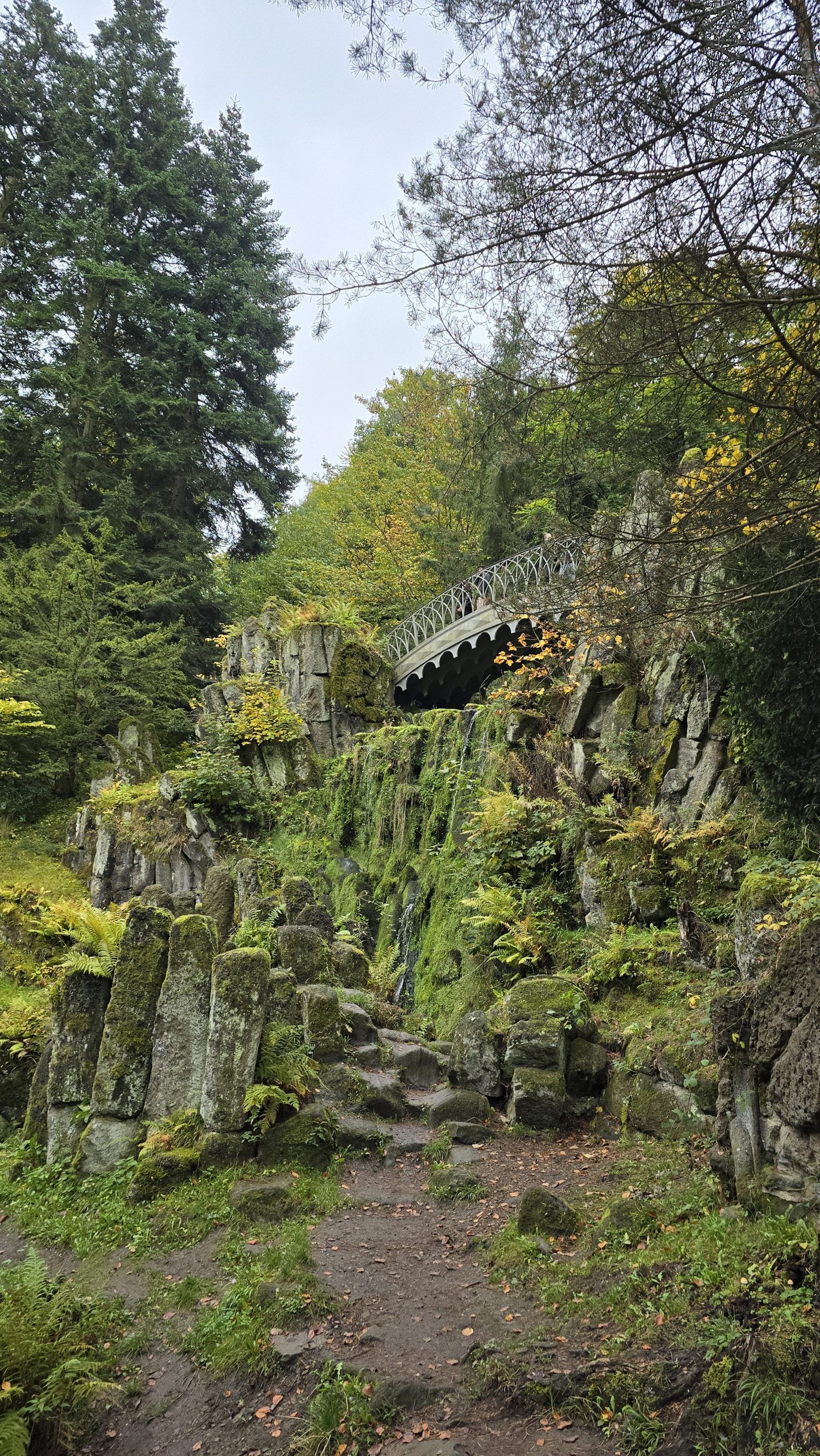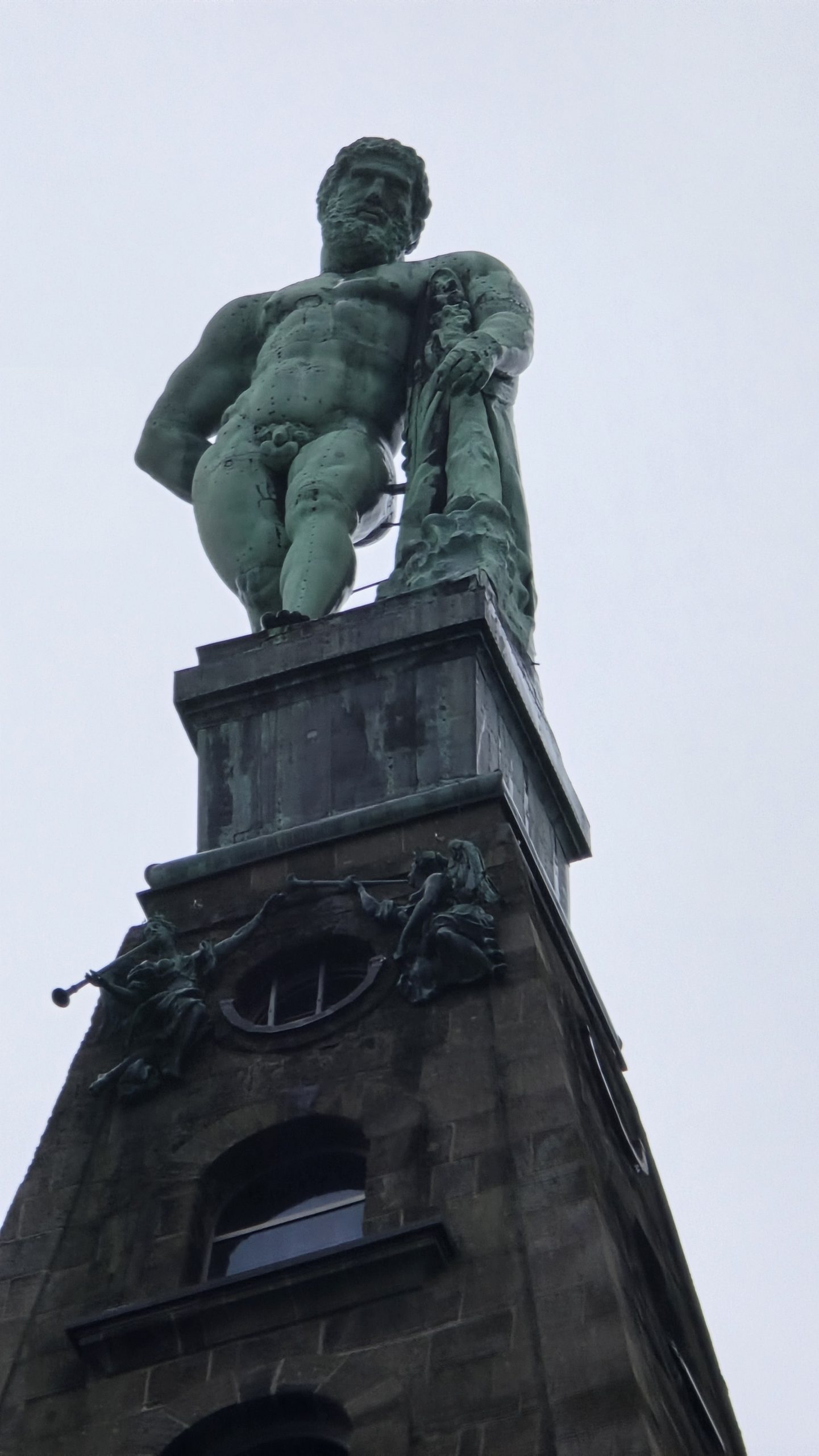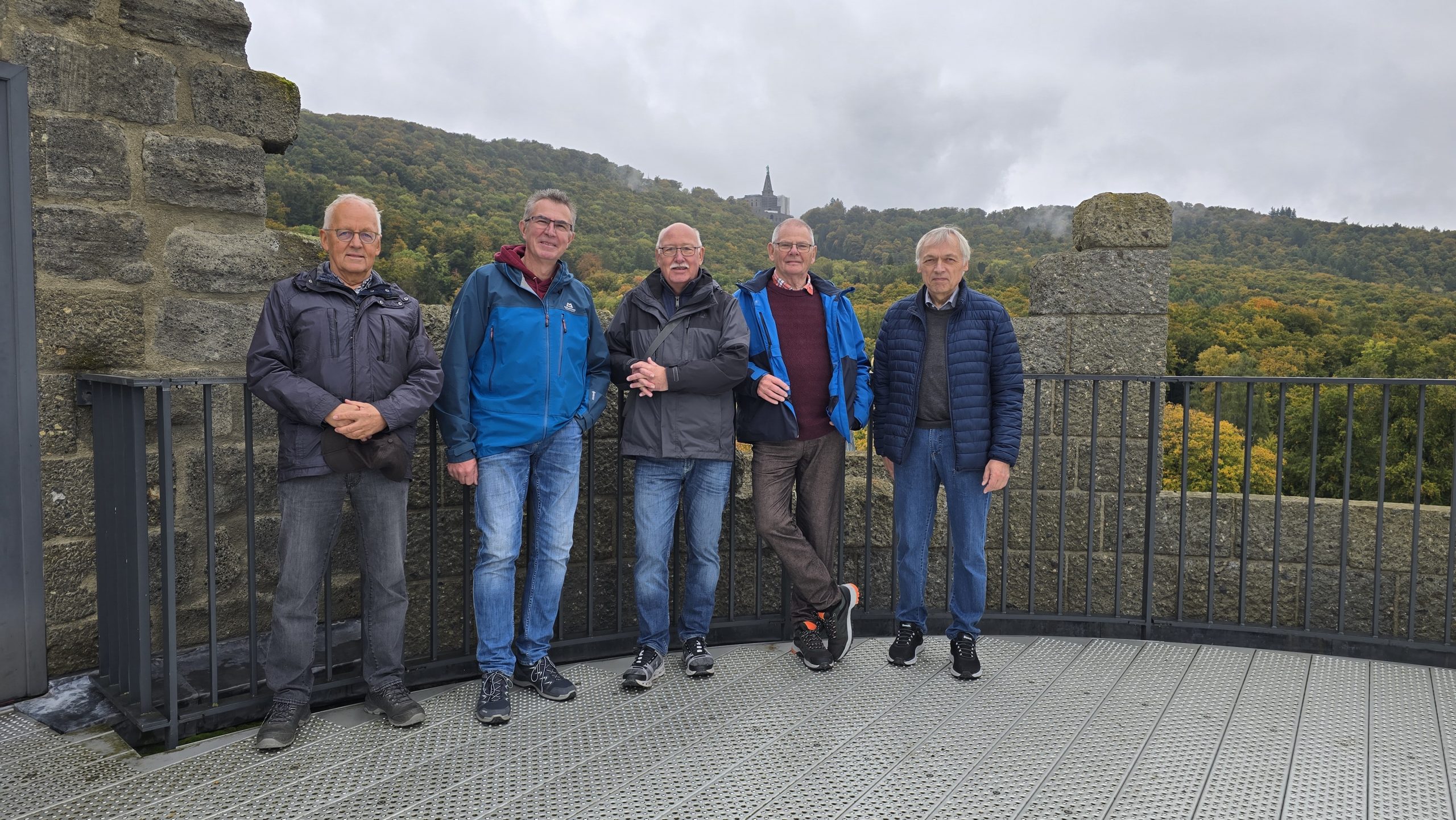 Nach einer rund 140 Kilometer langen Autofahrt erreichten wir das obere Besucherzentrum des Bergparks Wilhelmshöhe. Dort stärkten wir uns zunächst mit belegten Brötchen und Mettwürsten, die Thom freundlicherweise beisteuerte, sowie Getränken von Ulli. Die Mitarbeiter im Besucherzentrum begrüßten uns herzlich und so entstand gleich unser erstes Gruppenfoto. Unsere erste Etappe führte uns zum Herkules, für den wir eine schier endlose Zahl an Stufen meisterten. Von oben bot sich ein erster Blick auf den Wilhelmspark, der am Morgen jedoch noch in dichten Nebel gehüllt war.