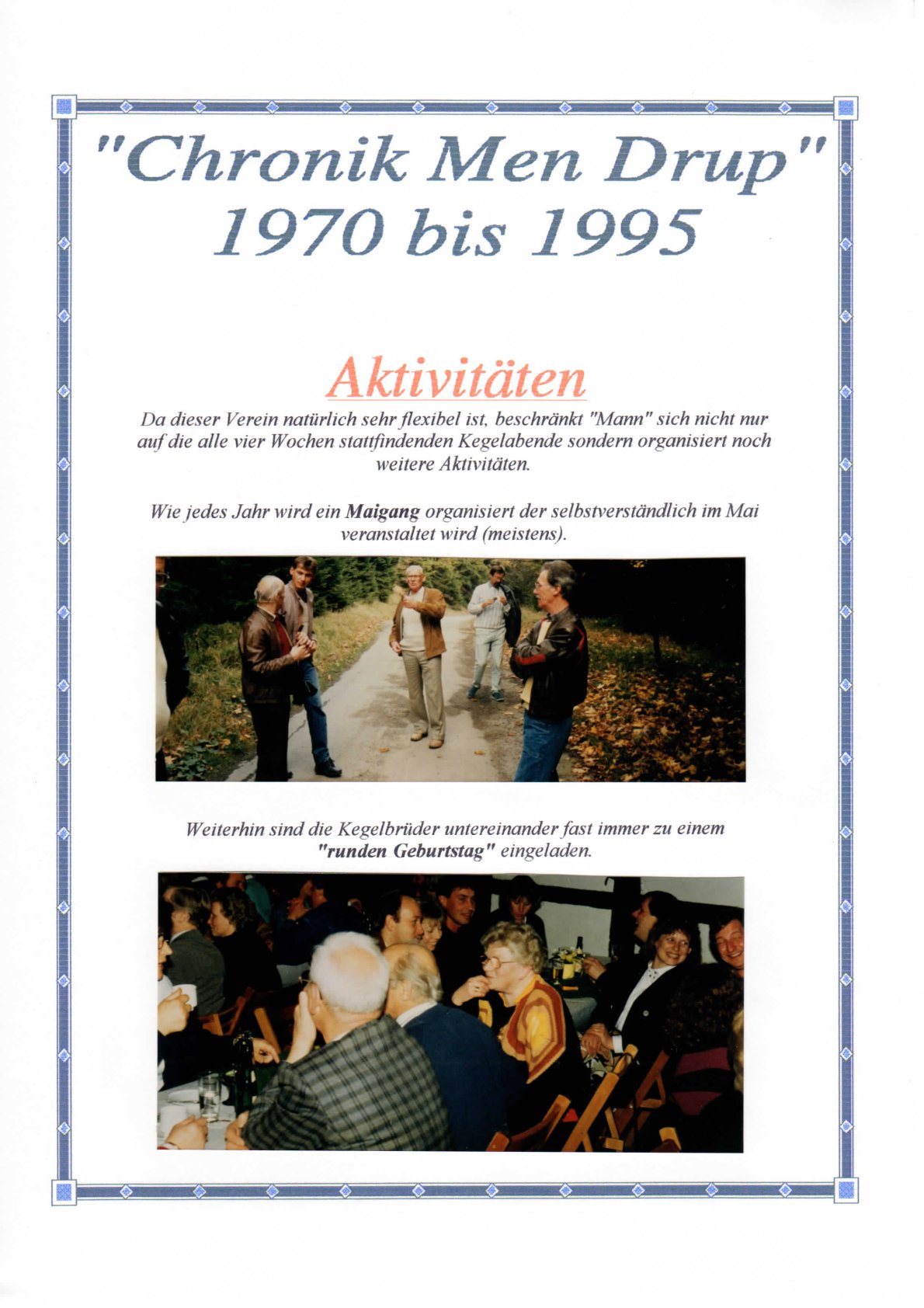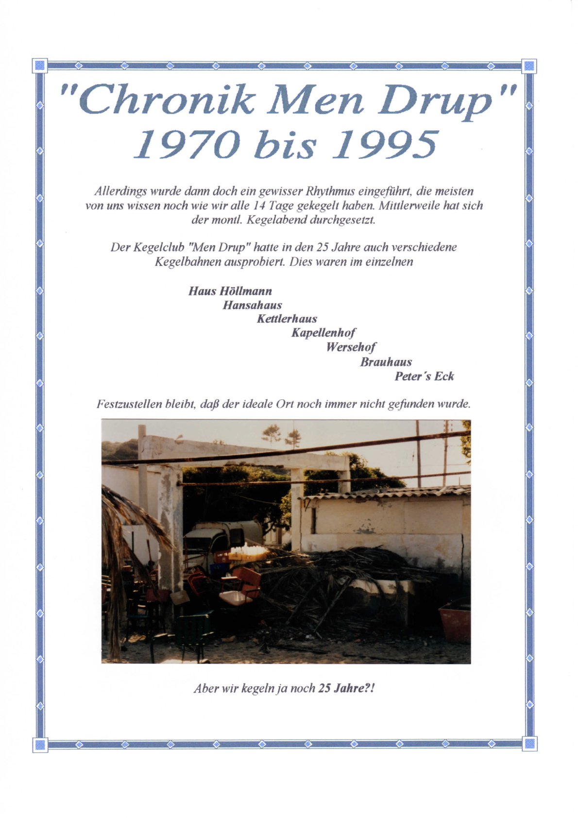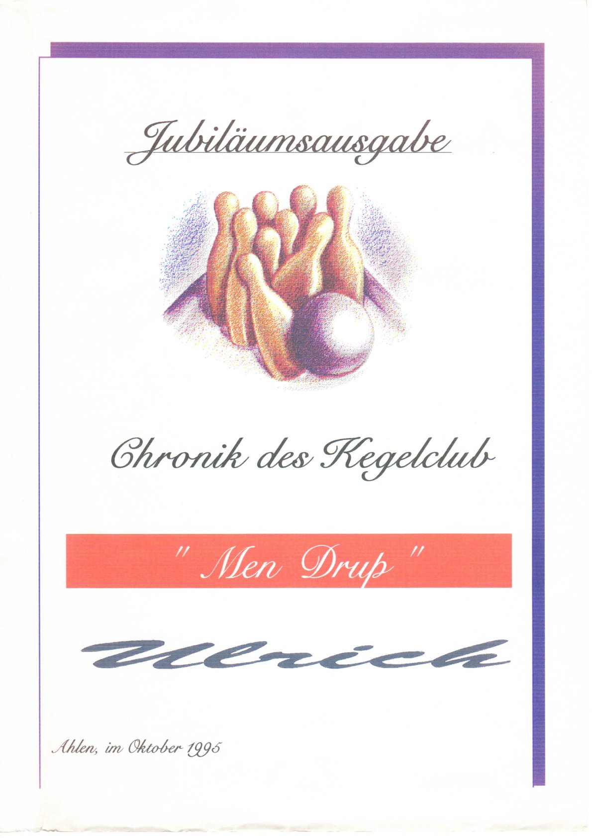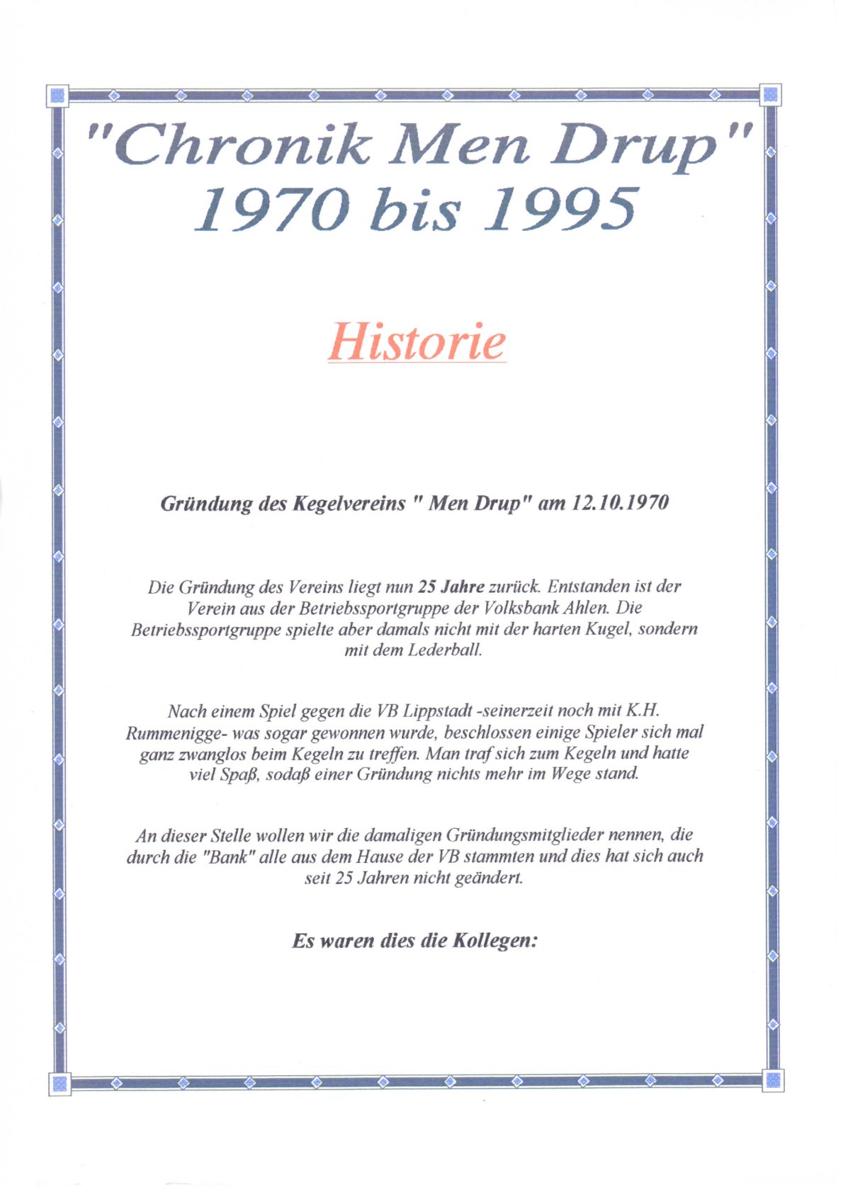 Unser Kegelclub wurde am 12. Oktober 1970 gegründet. Was danach geschah, steht in einer Chronik, die anlässlich des 25. Jubiläums veröffentlicht wurde und von unserem ehemaligen Kegelbruder Ludger erstellt wurde.